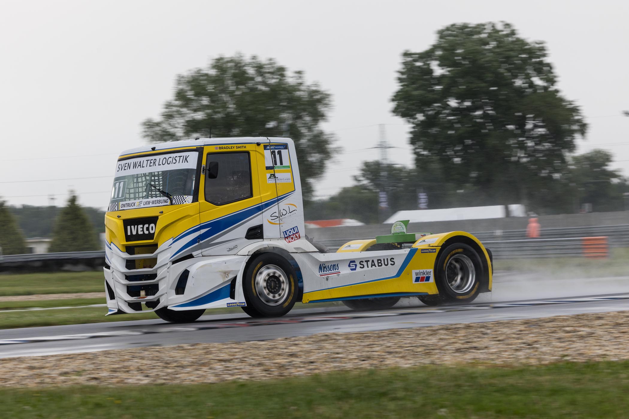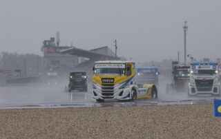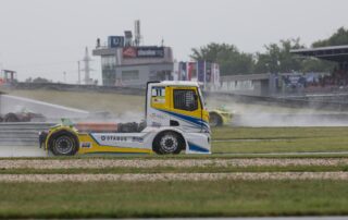 Beim Start des dritten Championshiprennens waren die Verhältnisse ziemlich chaotisch geworden, angesichts des starken Regens war der Rennabbruch nach zwei Runden erwartbar. Etliche Trucks waren ins Kiesbett getrudelt, ein Wettbewerber benötigte die Abschlepper und war daher für den Neustart nicht mehr startberechtigt. Der Start zum zweiten Aufgalopp zog sich hin, nach rund zwei Stunden reihten sich das Feld erneut hinter der Startlinie auf, um die restlichen fünf Runden zu absolvieren, die nötig waren, damit das Rennen gewertet werden konnte.